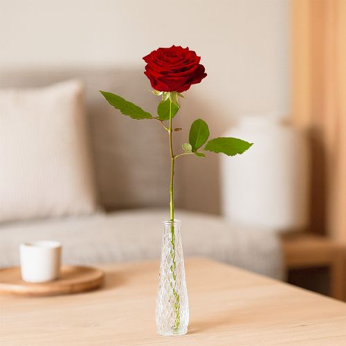 Show your affection with a single Red Naomi rose, delivered in an elegant glass vase. This timeless gift represents love, passion and style. Perfect for saying "I love you," "Thinking of you" or "I'm sorry."