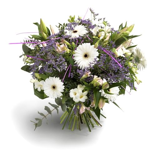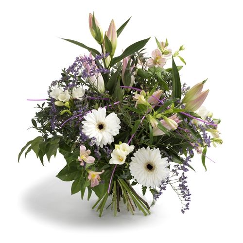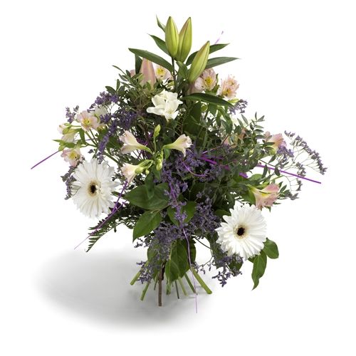 Scheinbar spontan arrangiert! Eine Komposition aus weißen Gerbera, rosa Lilien und lila Santini - die Anmutung eines Kunstwerkes entsteht durch dekorative violette Stäbchen.