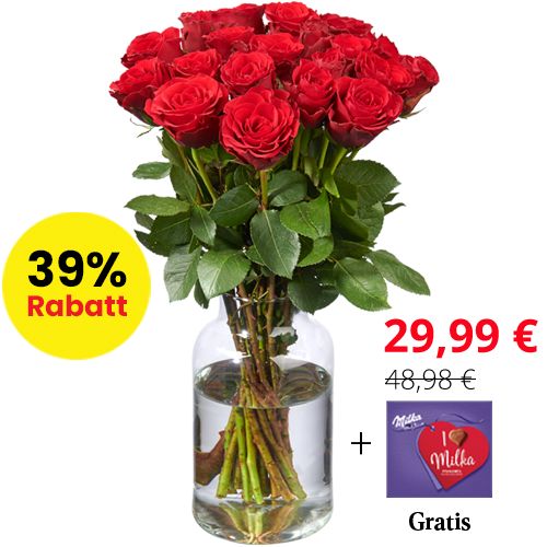Suchen Sie nach einem romantischen Strauß mit atemberaubenden und einzigartig schönen roten Rosen? Suchen Sie nicht mehr, denn unsere Premium Red Naomi Rosen mit super langem Blütenkopf und Stiel (60 - 70 cm) sind der zeitlose Klassiker für diese schönen und romantischen Anlässe. Jetzt zeitweilig inkl. Milka Pralines im Wert von 6,99 €.