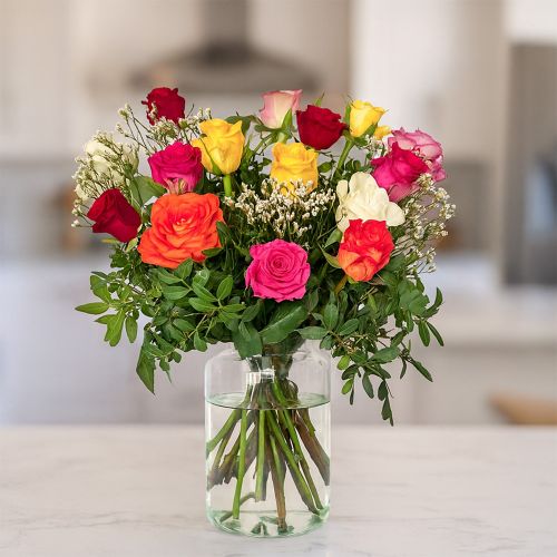 Verschenken Sie Freude und Farbe mit diesem wunderschönen Rosenstrauß! Die farbenfrohen Rosen in leuchtenden Tönen werden mit zartem Limonium und frischem Grün kombiniert: ein Bouquet, das sowohl verspielt als auch elegant wirkt.